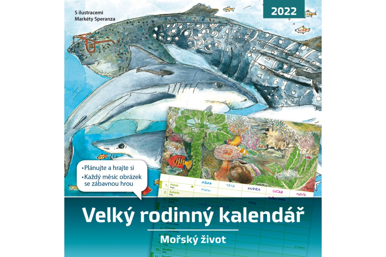 Pomoc při organizování a plánování rodinných aktivit vám usnadní „Velký rodinný kalendář 2022“ s podtitulem Mořský život. Kalendář má velký formát a můžete do něj přehledně zapisovat činnosti a plány až pro pět členů rodiny. Na každý měsíc je pro vás připraven obrázek z mořského světa. Ke každému obrázku se vždy váže zábavná hra, jejíž řešení je na konci kalendáře. Najdete zde i zajímavé informace o obyvatelích moří a oceánů. Kalendář obsahuje originální a hravé ilustrace české výtvarnice Markéty Speranza. Organizujte a plánujte čas své rodiny a objevujte tajemství velryb, žraloků a živočichů žijících v hlubinách oceánů, poznávejte život medůz, želv či rejnoků a dalších mořských tvorů.