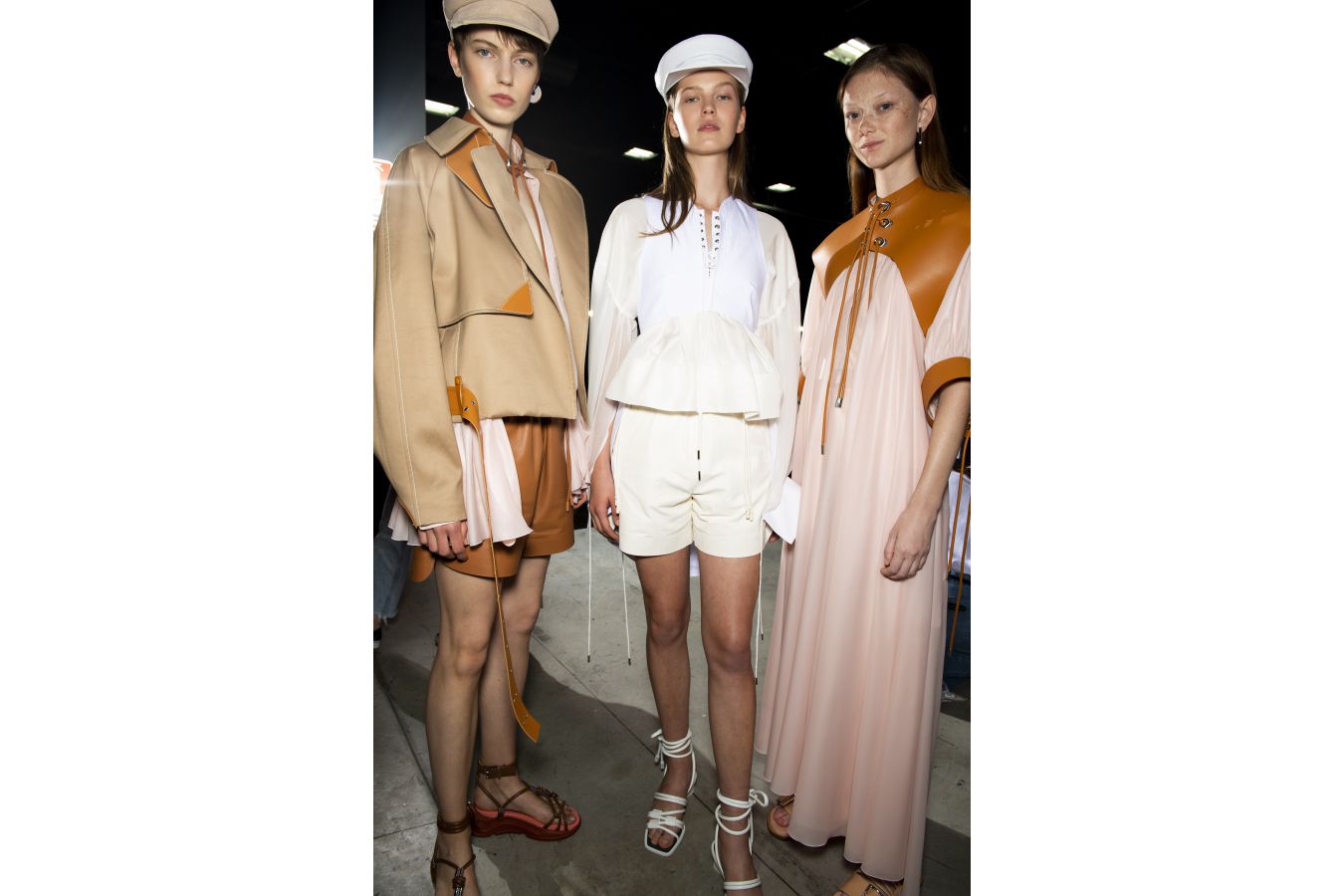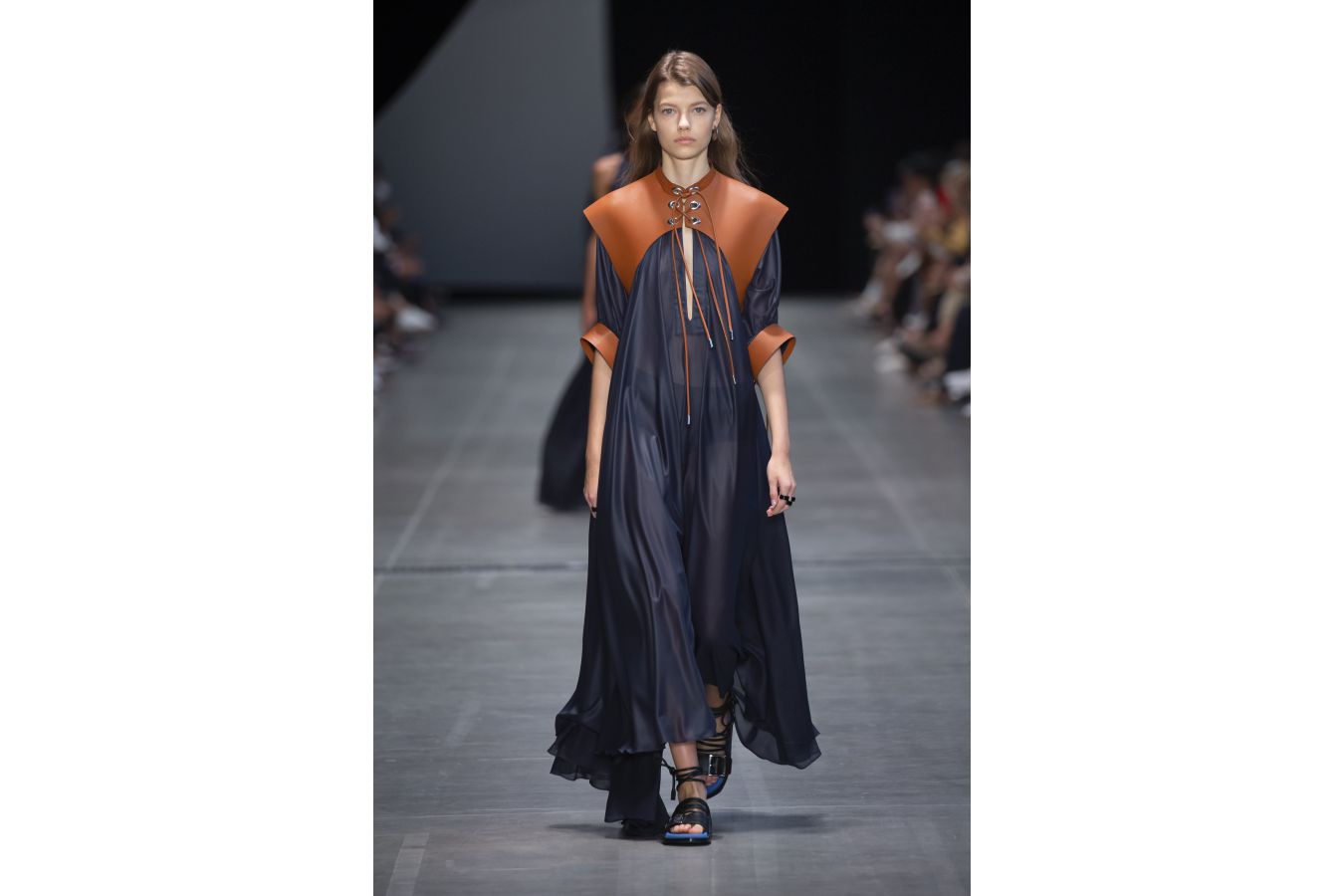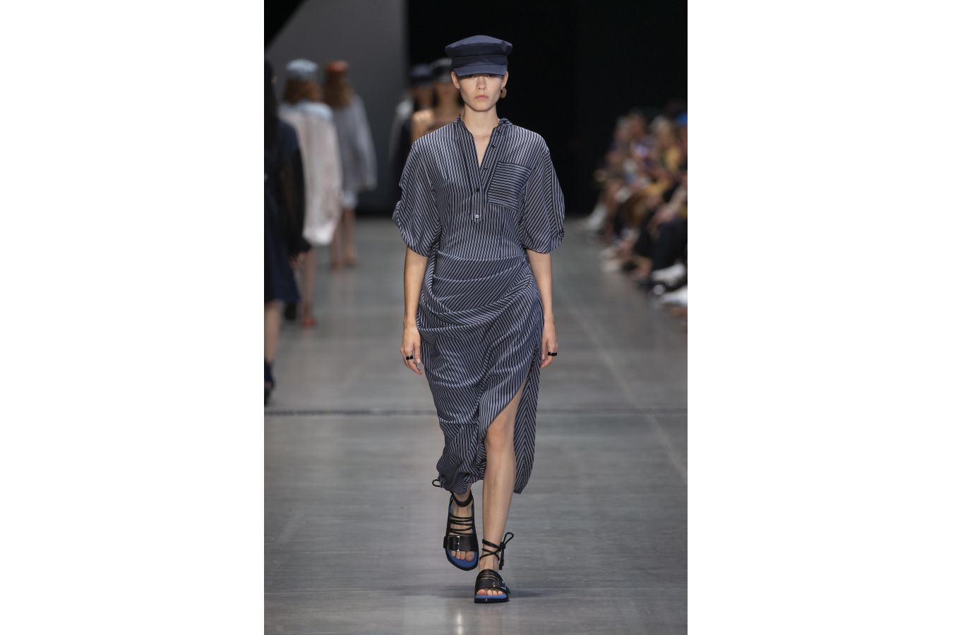 Pro léto ideální bavlněné tkaniny s pruhy, pogumovaný žerzej a žoržet, hedvábí a kůže. Kombinování a vrstvení kontrastních materiálů. Kůže na límečcích a manžetách splývavých šatů a lehkých košil. Sukně a vesty jsou ušity z naprosto unikátního materiálu vyrobeného z tkané kůže, která vytváří sofistikované grafické sklady. Lemy jsou buď začištěné roztřepením, nebo koženými dutinkami.