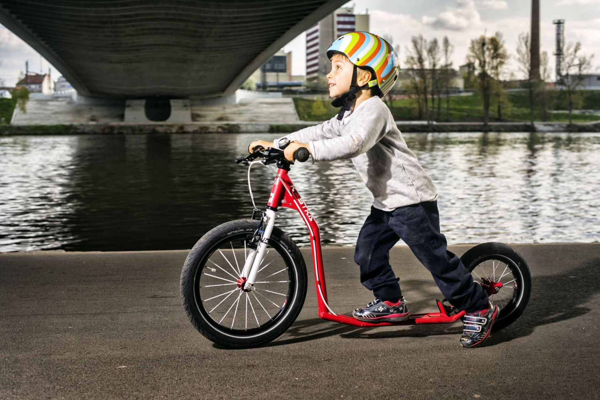 Koloběžka vyráběná v České republice, pro děti od 4 let, které si s ní zaručeně užijí spoustu skvělé zábavy. Postavena je na dvou stejně velkých 16tipalcových nafukovacích kolech, geometrie rámu je speciálně optimalizovaná pro malé jezdce. Díky tomu je tato dětská koloběžka snadno ovladatelná, má výbornou stabilitu a perfektní jízdní vlastnosti.