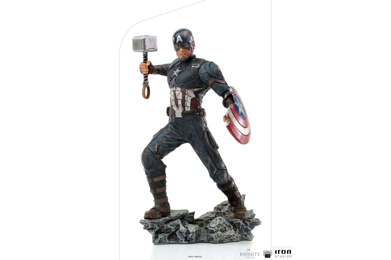 Soška z dílny Iron Studios je inspirovaná nezapomenutelnou scénou, ve které legendární kapitán Steve Roger, držící štít zničený Thanosovou silou, konečně pronesl slavný bojový výkřik: „Avengers Assemble“. Herec Chris Evans v roce 2011 debutoval ve filmu Captain America: The first Avenger, kde si zahrál hlavního představitele Steva Rogerse, mladého muže se silnou touhou pomoci své zemi během druhé světové války. Časem se Kapitán Amerika stal jedním z protagonistů marvelovského vesmíru. Sošku z řady Infinity Saga vytvořily legendární Iron Studios ve spolupráci s Marvel Entertainment. Soška je vyrobená v měřítku 1:10 z materiálu polystone, což je umělý kámen, a je ručně malovaná. Je součástí limitované sběratelské edice a zakoupit ji můžete na e-shopu Jabadaba.cz.