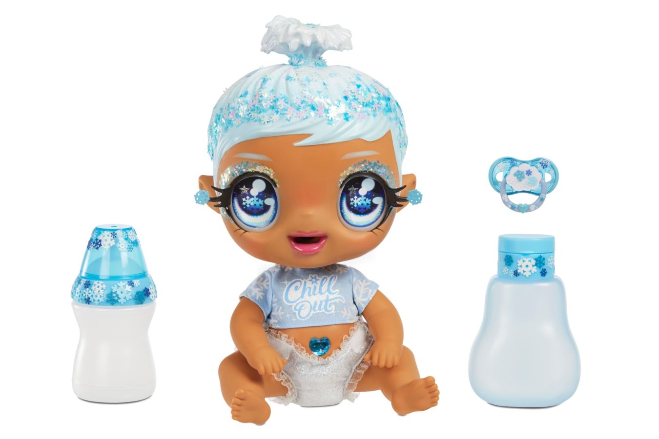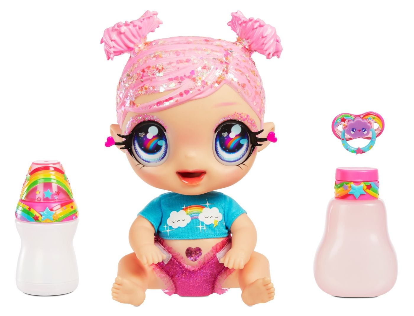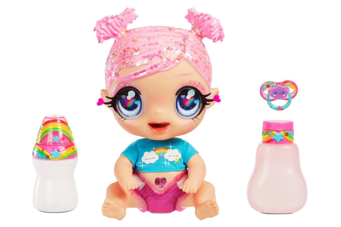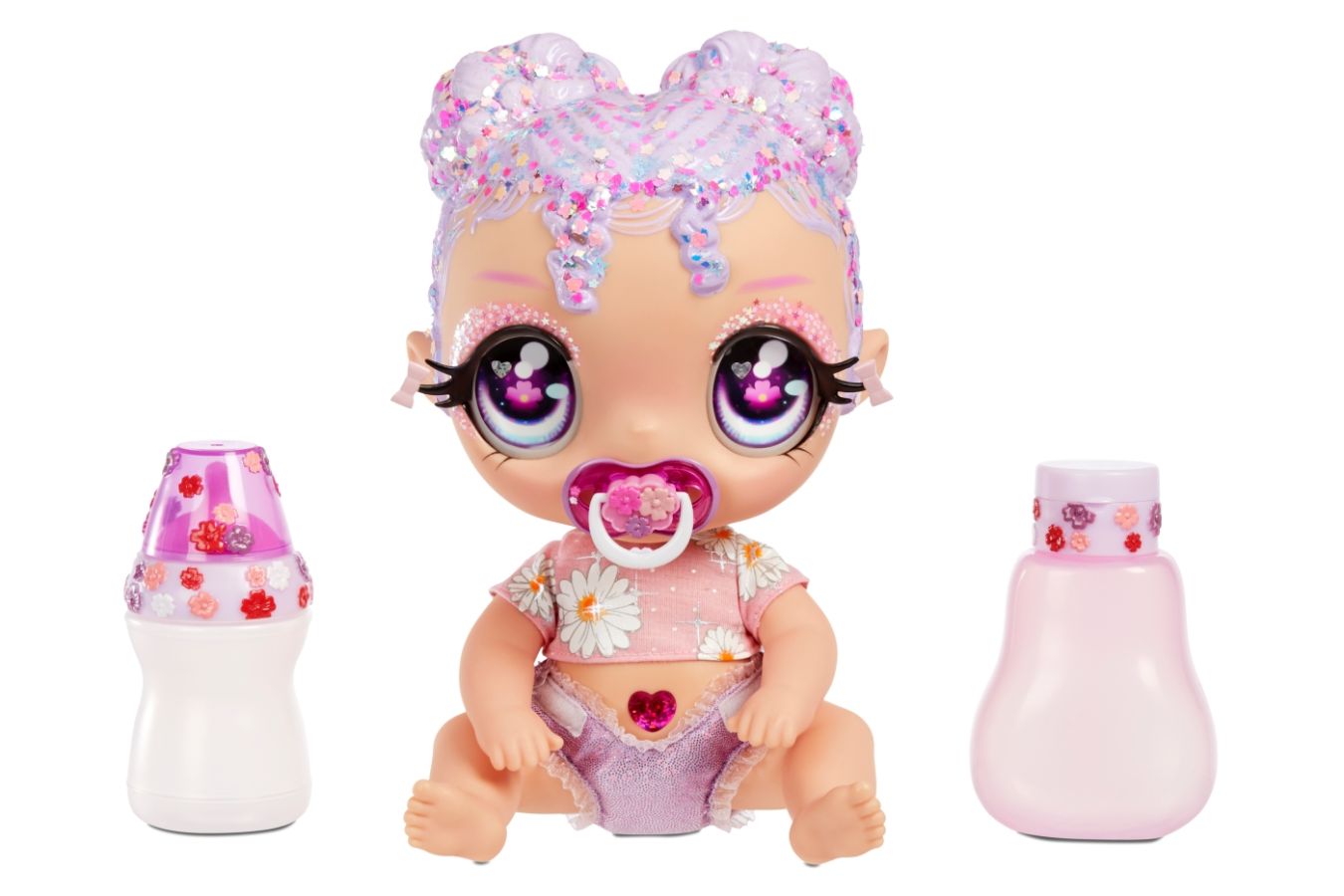 Glitter Babyz panenka-miminko je k dispozici ve 4 barevných variantách, designově laděných od světle růžové až do modro-fialové. Každá z panenek má tak jiný styl a jinak barevně laděné doplňky. K dostání v každém dobrém hračkářství.
