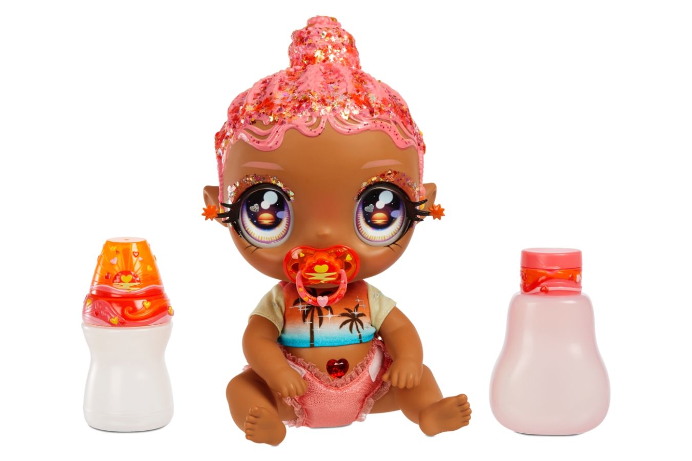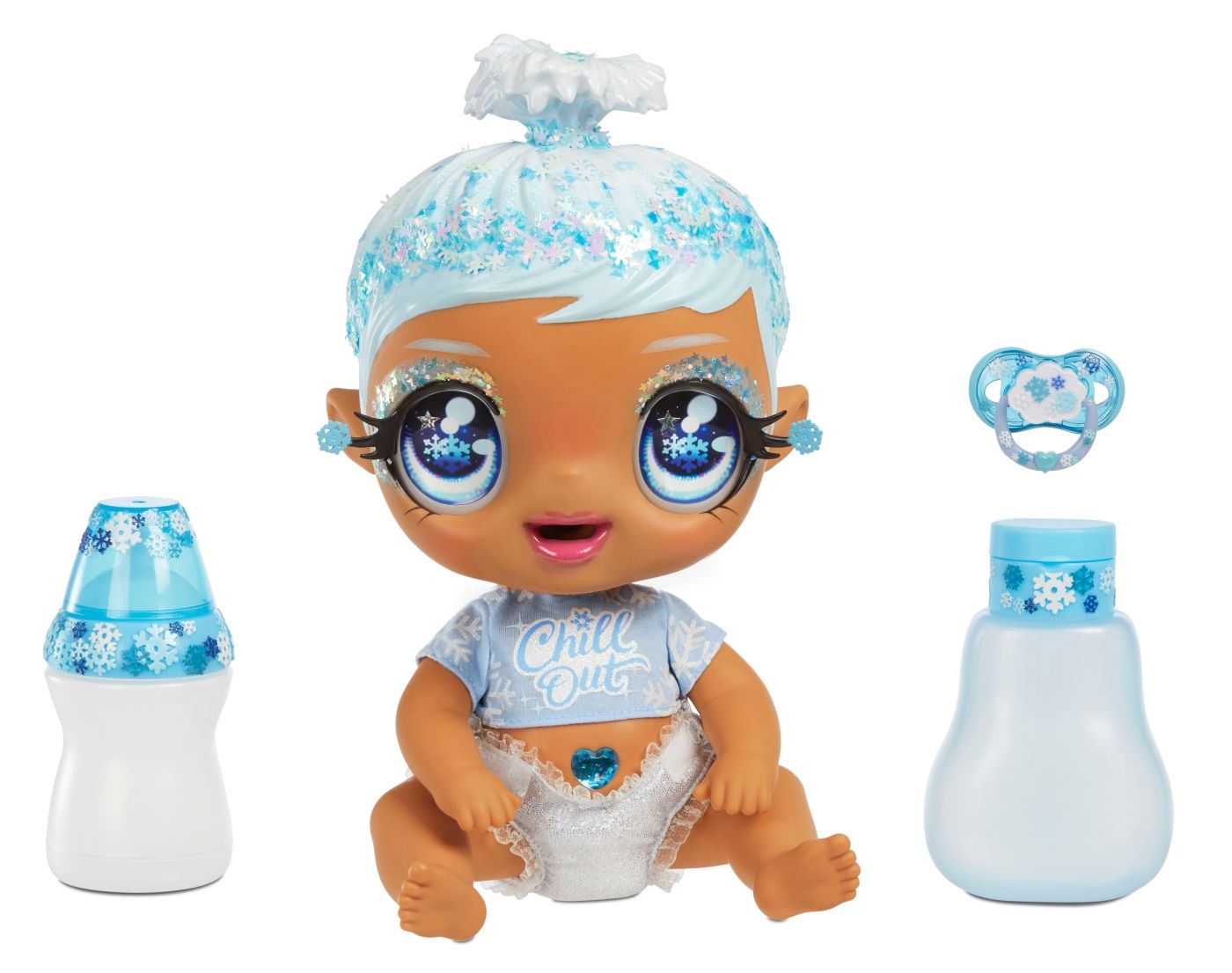 Seznamte se se zcela novou značkou Glitter Babyz, novinkou v portfoliu oblíbené hračkářské firmy MGA, a obdarujte své holčičky jedinečnou, rozkošnou a téměř kouzelnou Glitter Babyz, panenkou ve stylu miminka. Jedná se o unikátní velkou panenku v designu miminka, plnou glitrů, třpytek, lesku a jisker, která holčičky naprosto uchvátí už na první pohled. Upoutá především svým roztomilým láskyplným obličejíkem, velkýma barevnýma lesknoucíma se očima, řasami plnými jisker, a hlavně pestrobarevnými vlásky staženými do culíků nebo drdolu, které jsou navíc plné barevných lesknoucích se třpytek. Tím ale zábava s panenkou nekončí! Kromě úžasného vzhledu je panenka ještě vybavena celou řadou doplňků a zábavných funkcí, a holčičkám tak může nabídnout nespočet dalších překvapení. Je jimi například stylová barevně sladěná lahvička na pití měnící barvu a nechybí ani lahvička na „kouzelný“ šampon, po jehož použití vlasy panenky změní barvu. Dalším doplňkem je i plenka, do níž miminko čůrá, nebo designové barevné tričko sladěné s panenkou. K tomu všemu lze navíc Glitter Babyz tvarovat do různých pozic. Potěší i velikost panenky, která je v sedě krásných 20 cm a pokud ji holčička postaví na nohy, získá panenka hned úctyhodných 30 cm!