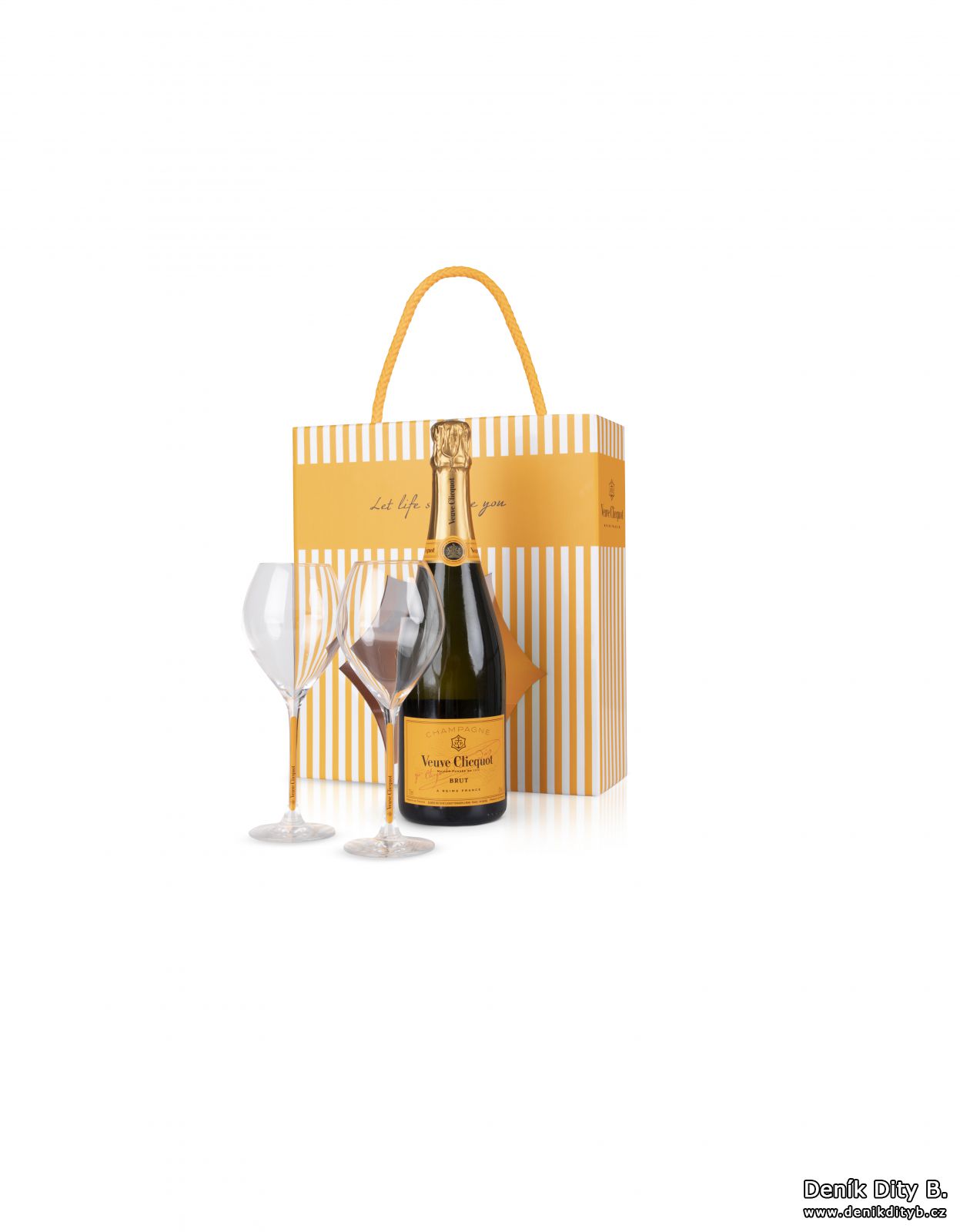 Tato nabídka (1 láhev Veuve Clicquot 75 cl Brut se dvěma stylovými sklenkami na žluté nožce) bude dostupná ve vybraných obchodech do vyprodání zásob. Její doporučená maloobchodní cena je 1 400 Kč.
