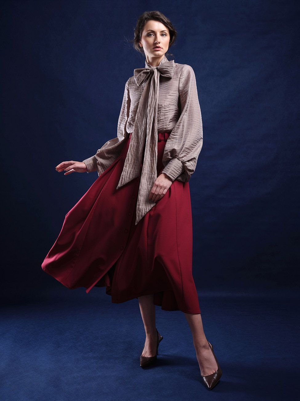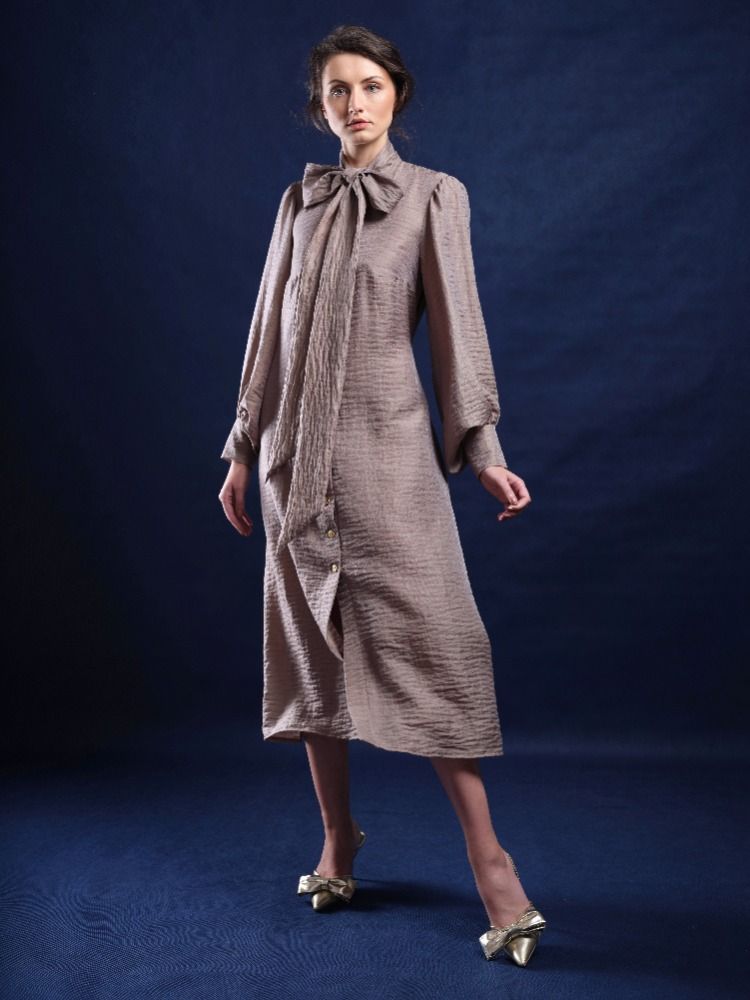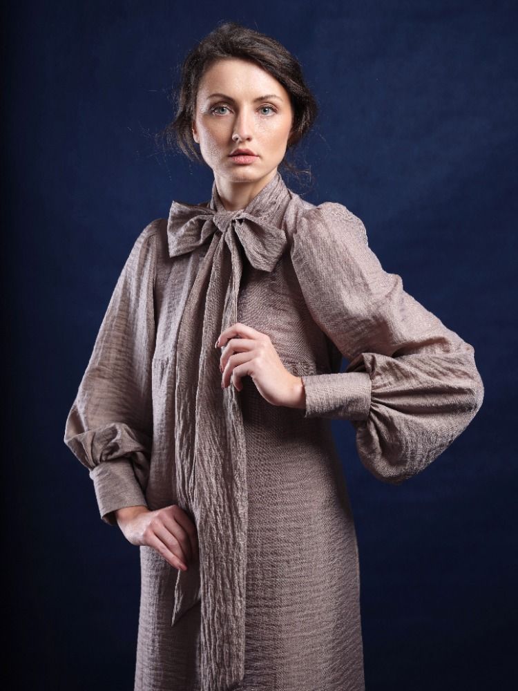 Kolekce vypráví příběh o kontrastech – propojuje ženskou křehkost s odhodláním. Dominují jí hedvábně lesklé materiály, jemné a měkké látky, které se přirozeně přizpůsobují siluetě. Barevná paleta se pohybuje od teplých odstínů karamelu a mědi, přes tlumené tóny perlové šedi, až po hluboký inkoustový odstín.