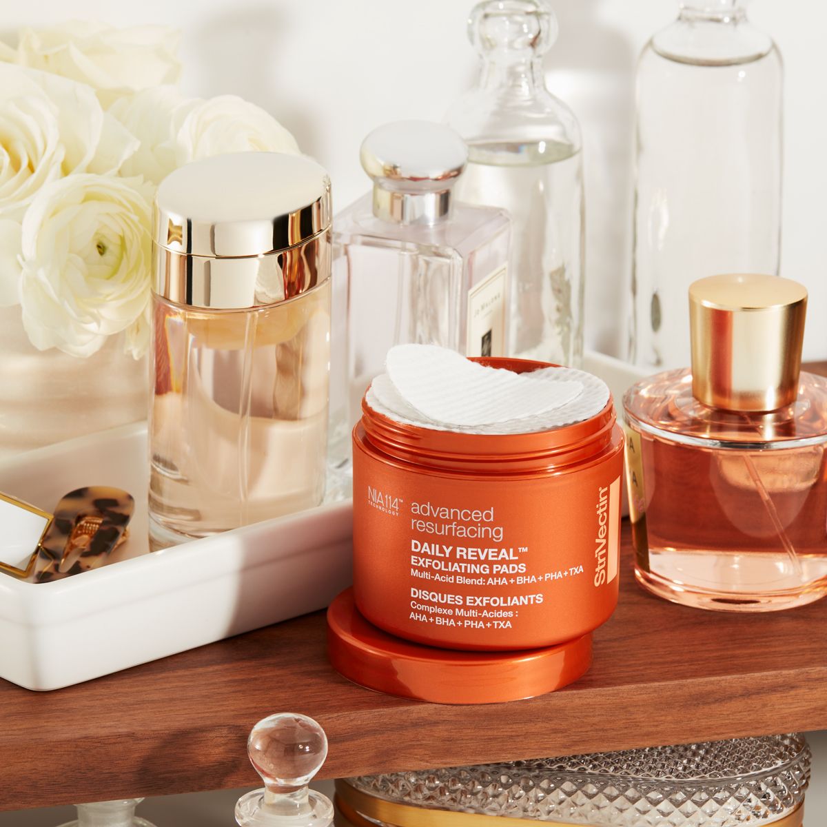 Exfoliační polštářky jemně, ale důkladně odstraňují odumřelé kožní buňky, čímž podporují přirozenou exfoliaci pleti. Současně stahují póry a zanechávají pokožku čistší, hladší a zářivější. Klinické výzkumy potvrzují, že už po třech dnech pravidelného používání je pleť viditelně svěžejší a sjednocenější.