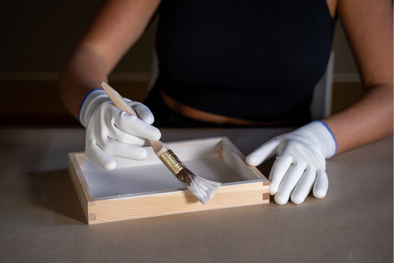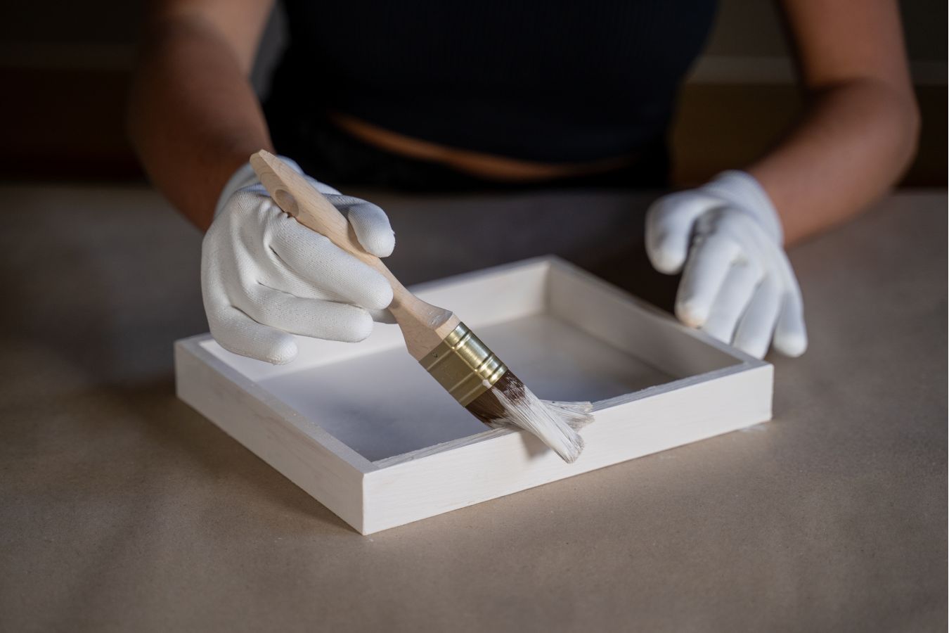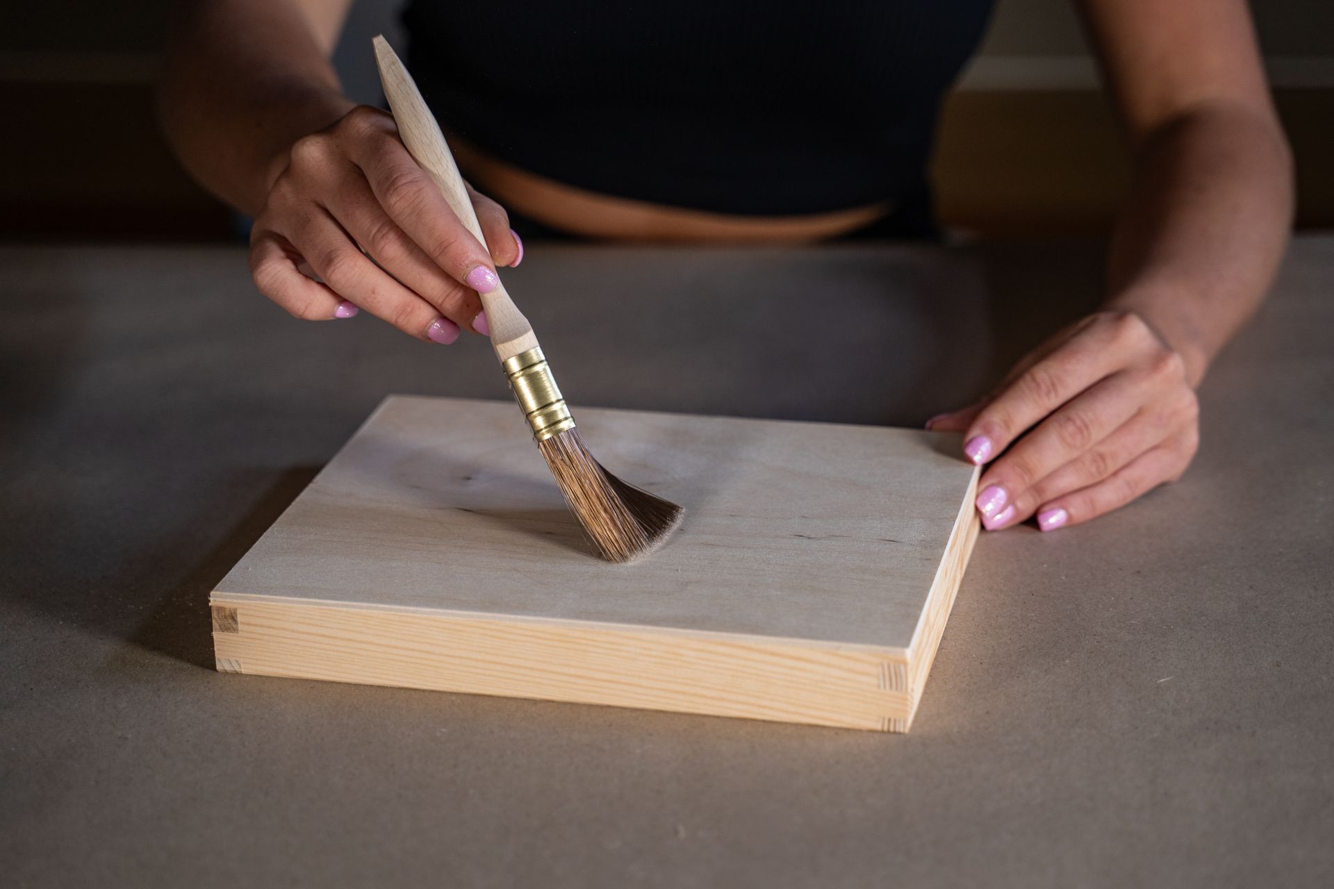 Dřevěný podnos nejdříve jemně zbruste a poté omeťte od prachu. Povrch musí být také zbaven všech nečistot, mastnoty a případných starých nepřilnavých nátěrů. Krycí barvu před použitím důkladně promíchejte. Nanášejte ji plochým štětcem ve 2 vrstvách s odstupem alespoň 2 hodiny.