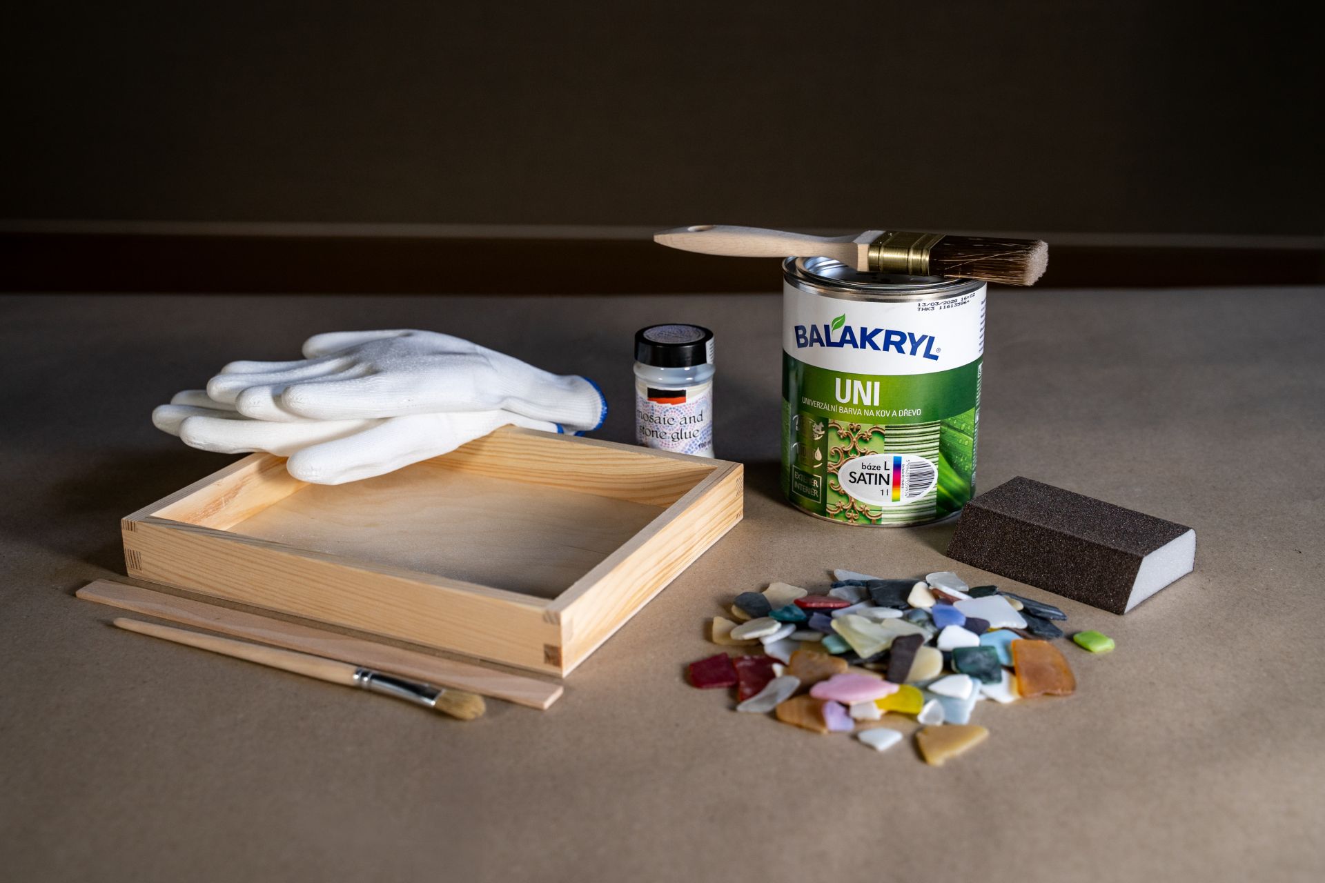 Na výrobu budete potřebovat libovolný dřevěný podnos, skleněné mozaikové střepy nebo kamínky (k dostání v obchodech s výtvarnými potřebami), lepidlo na mozaiku, jemnou brusnou houbu, plochý štětec (vel. 1,5“), tenký výtvarný štětec, ochranné rukavice a vodou ředitelnou barvu Balakryl UNI satin.