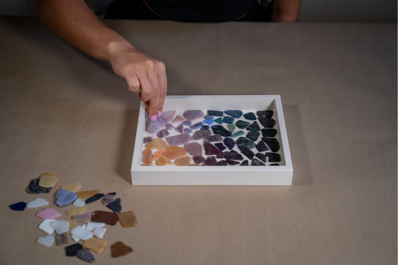 Pak přichází na řadu sestavení mozaiky. Skleněné střepy doporučujeme na podnos nejdříve cvičně vyskládat tak, aby zabíraly celou plochu a nikde nezůstala velká mezera. Nezapomeňte si také rozvrhnout barevné kombinace, případně motiv. Jakmile budete s výsledkem spokojeni, zafixujte postupně všechny střepy pomocí tenkého štětečku a lepidla.