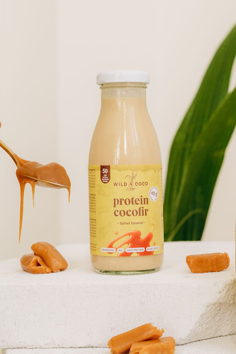Protein Cocofir – fermentovaný rostlinný „kefír“ z mladého kokosu obsahuje 10 g rostlinného proteinu, 50 miliard přátelských bakterií a komplex pre‑, pro‑ i postbiotik. Dostupný v příchutích banán–citron, čokoláda nebo slaný karamel.