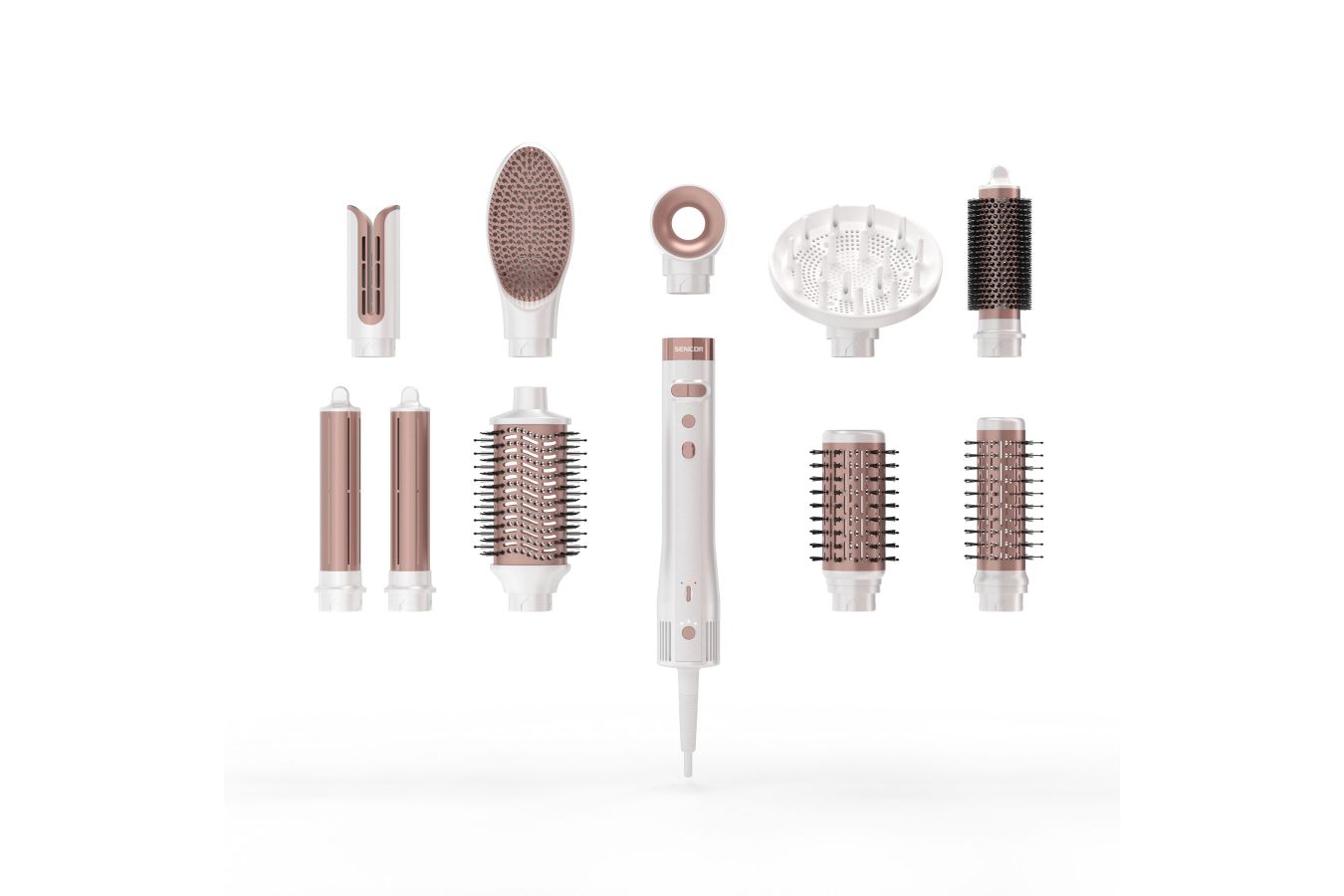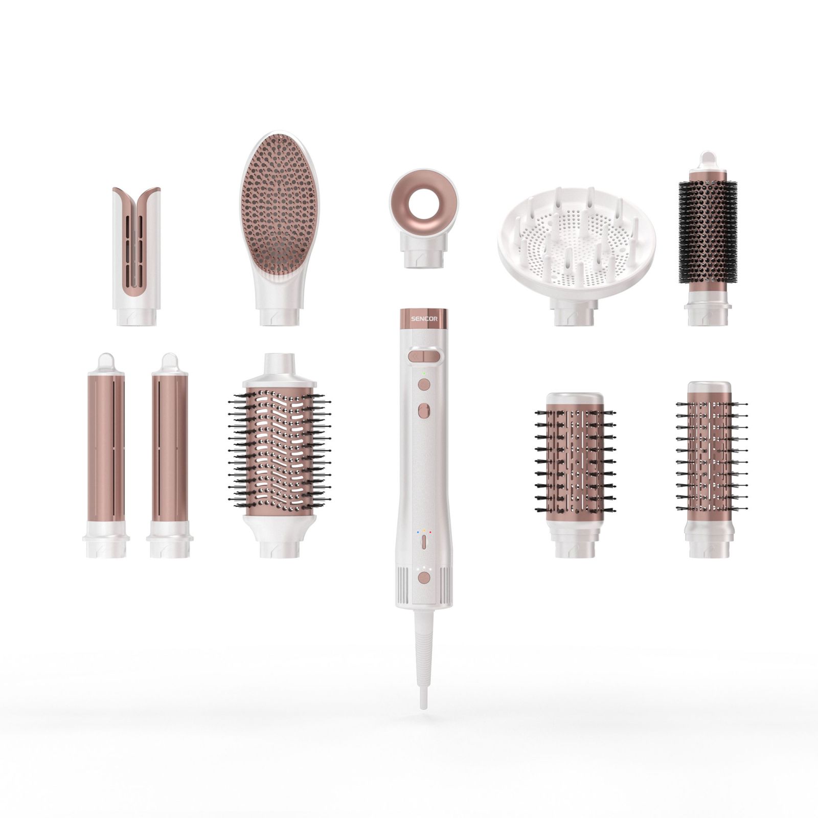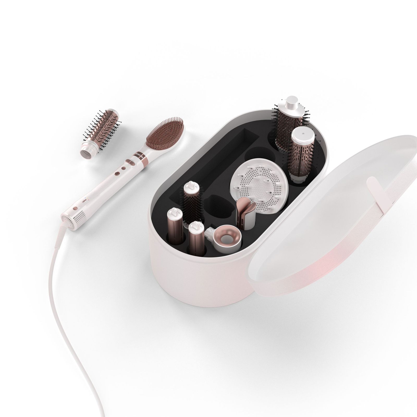 Součástí balení je deset nástavců, které z jednoho přístroje dělají univerzální nástroj pro každodenní úpravu vlasů. Nechybí hlavice pro rychlé vysoušení, difuzér pro kudrnaté vlasy ani nástavec pro vyhlazení. Pro lokny slouží dva 32mm nástavce využívající Coanda efekt, rotační kartáče o průměru 38 a 50 mm vytvoří přirozené vlny a oválný kartáč dodá objem. Dvojice hřebenových kartáčů usnadní rozčesávání.