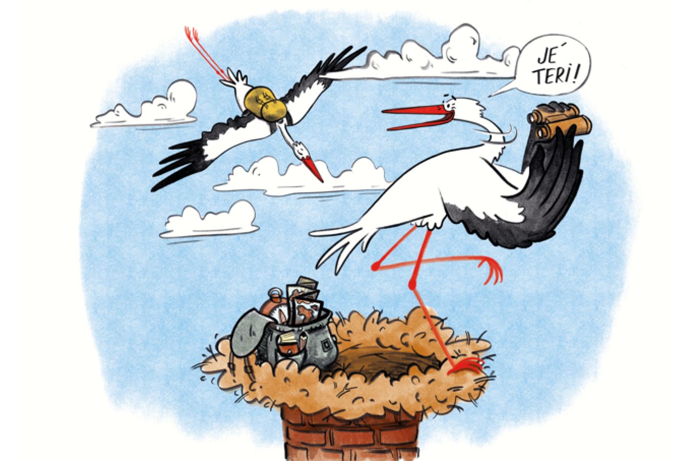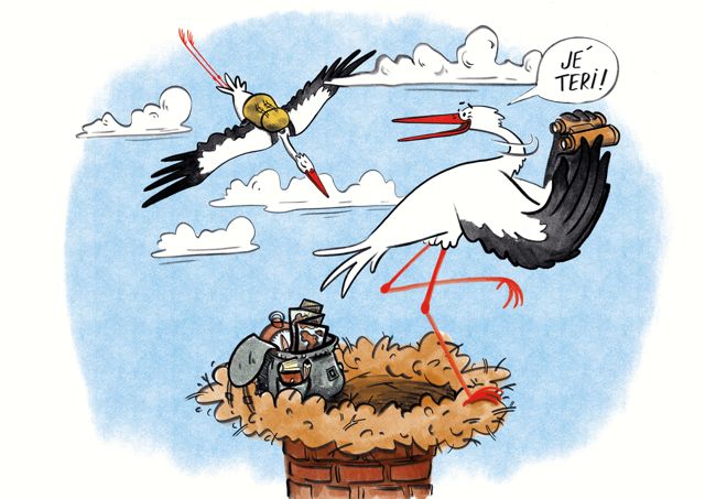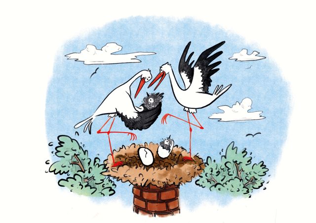 „Ťuk, ťuk, ťuky, ťuk,“ ozve se po několika týdnech zahřívání vajec z toho prvního. „Honzo, Honzo, myslím, že je to tu,“ volá rozrušená Terezka. První čápík chce na svět. A opravdu, na skořápce vejce se objeví dírka a čapí miminko se ohlásí slabým zapípáním. Za chvíli se z vejce odloupne vrchlík a vykoukne z něj maličké šedivé čapí miminko. „Máme kluka jako buka,“ rozesměje se Honza, „letím mu pro nějaké žížaly a slimáky, ať má sílu.“ „Nic velkého,“ stará se Terezka, „podívej, jaký má maličký zobáček, je krásný tmavě šedý, skoro černý, stejně jako jeho nožky.“