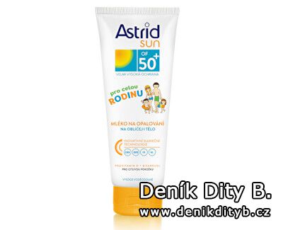 Slunečních paprsků jsme se nemohli dočkat, ale myslíme i na ochranu citlivé pokožky dětí i dospělých. Použijeme-li ASTRID SUN Rodinné mléko na opalování OF 50+ s inovativní sluneční technologií, minimalizuje riziko vzniku alergických reakcí, a navíc je vysoce voděodolné. UVA/UVB/IR/VL poskytuje pokožce širokospektrální fotostabilní ochranu před škodlivými vlivy UV a infračerveného záření a viditelného světla.