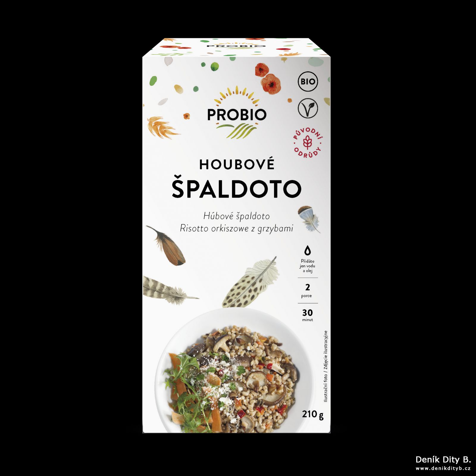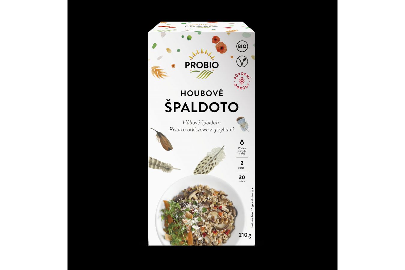 Houbové a zeleninové špaldoto je nejprodávanější klasika. Špaldu na špaldoto pěstují v PROBIO na vlastní farmě ve Velkých Hostěrádkách. Jde vždy o původní nepřešlechtěnou odrůdu s výbornými nutričními vlastnostmi. Je velmi dobře stravitelná, ve středověku s ní dokonce léčili. Jako základ špaldota je špaldové kernotto, jemně obroušené špaldové zrno (kroupy), k nimž se přidávají sušené hříbky, koření a bylinky (houbová varianta) nebo sušená rajčata a jiná zelenina, koření a bylinky (zeleninová varianta). Špaldoto je skvělým parťákem na doma, cesty i dovolené, hotové je během 30 minut a téměř bez práce. Je velmi chutné, a protože je celozrnné, zasytí na dlouhou dobu.