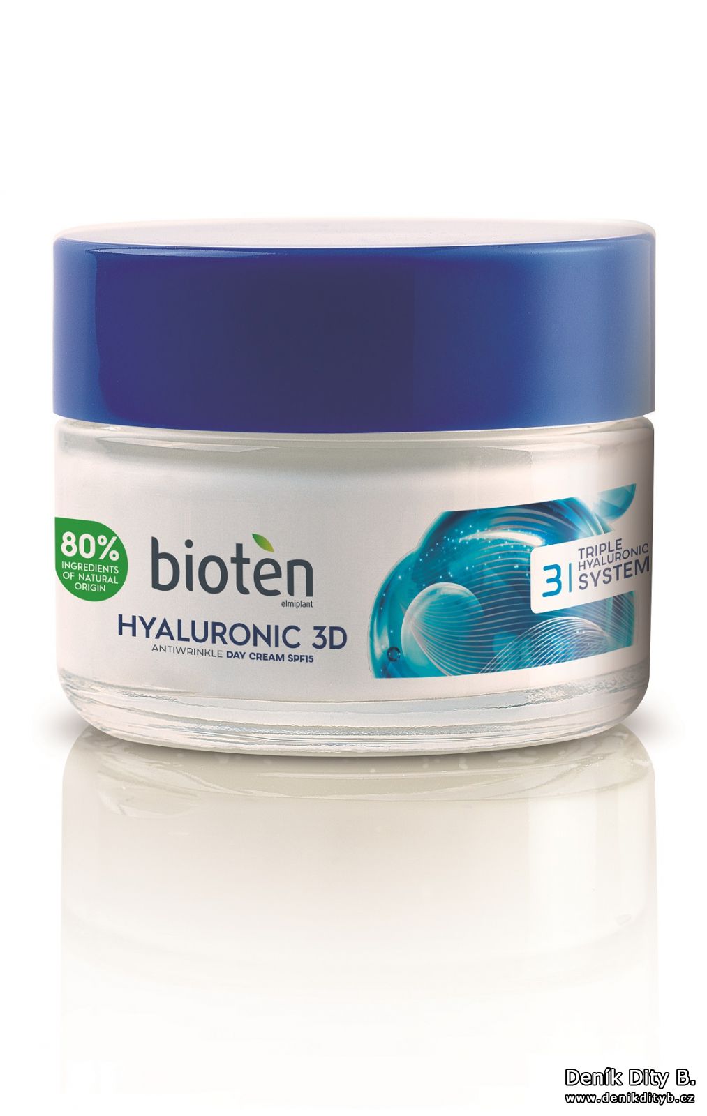Bioten Hyaluronic 3D denní krém s 80 % ingrediencí přírodního původu je vysoce účinným přípravkem proti vráskám. Obsahuje kyselinu hyaluronovou s nízkou molekulární hmotností, která proniká do nejhlubších vrstev pokožky, kde redukuje vrásky, a Hyaluronic Acid Stimulator, který stimuluje přirozenou syntézu kyseliny hyaluronové v pokožce. Dopřejte své pleti hydratační péči od značky Bioten.