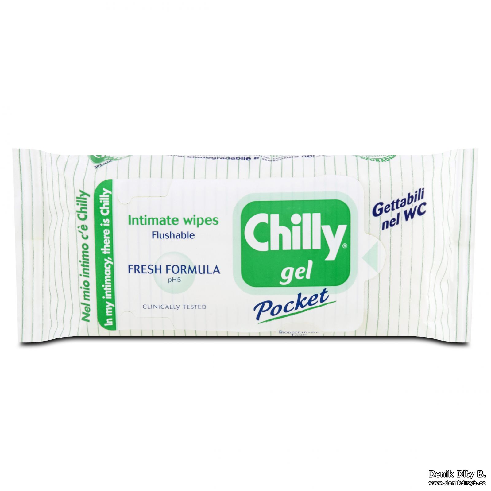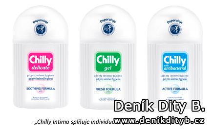 PROČ PRÁVĚ CHILLY? Jelikož nabízí řadu gelů i praktických ubrousků pro intimní hygienu „Chilly intima Pocket“, vhodných pro každodenní použití, ve variantách splňujících individuální potřeby každé ženy. Mycí gely Fresh, Delicate, Antibacterial, Hydrating a pH 3,5 jsou klinicky testované a hypoalergenní. Chilly splňuje všechny zásady správné intimní hygieny: má kyselou hladinu pH, jež udržuje a obnovuje přirozené vaginální prostředí a obsahuje kyselinu mléčnou, která podporuje zdravou bakteriální flóru. Gely Chilly intima doporučuje Česká gynekologická a porodnická společnost.
