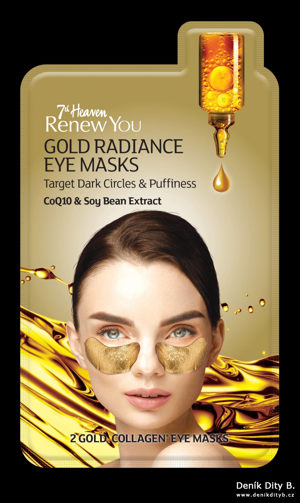 7th Heaven zlatá maska na váčky a kruhy pod očima oživuje unaveně vyhlížející oči, pomáhá redukovat výskyt tmavých kruhů i váčků pod očima. Obsahuje koenzym Q10 a extrakt ze sojových bobů. Pro lepší výsledek uložte proužky před použitím na 10 min. do lednice. Nechte je pak po aplikaci působit 15-20 minut. Proužky odstraňte a jemně vklepejte zbylou esenci do pokožky. Doporučená maloobchodní cena je 99,90 Kč.