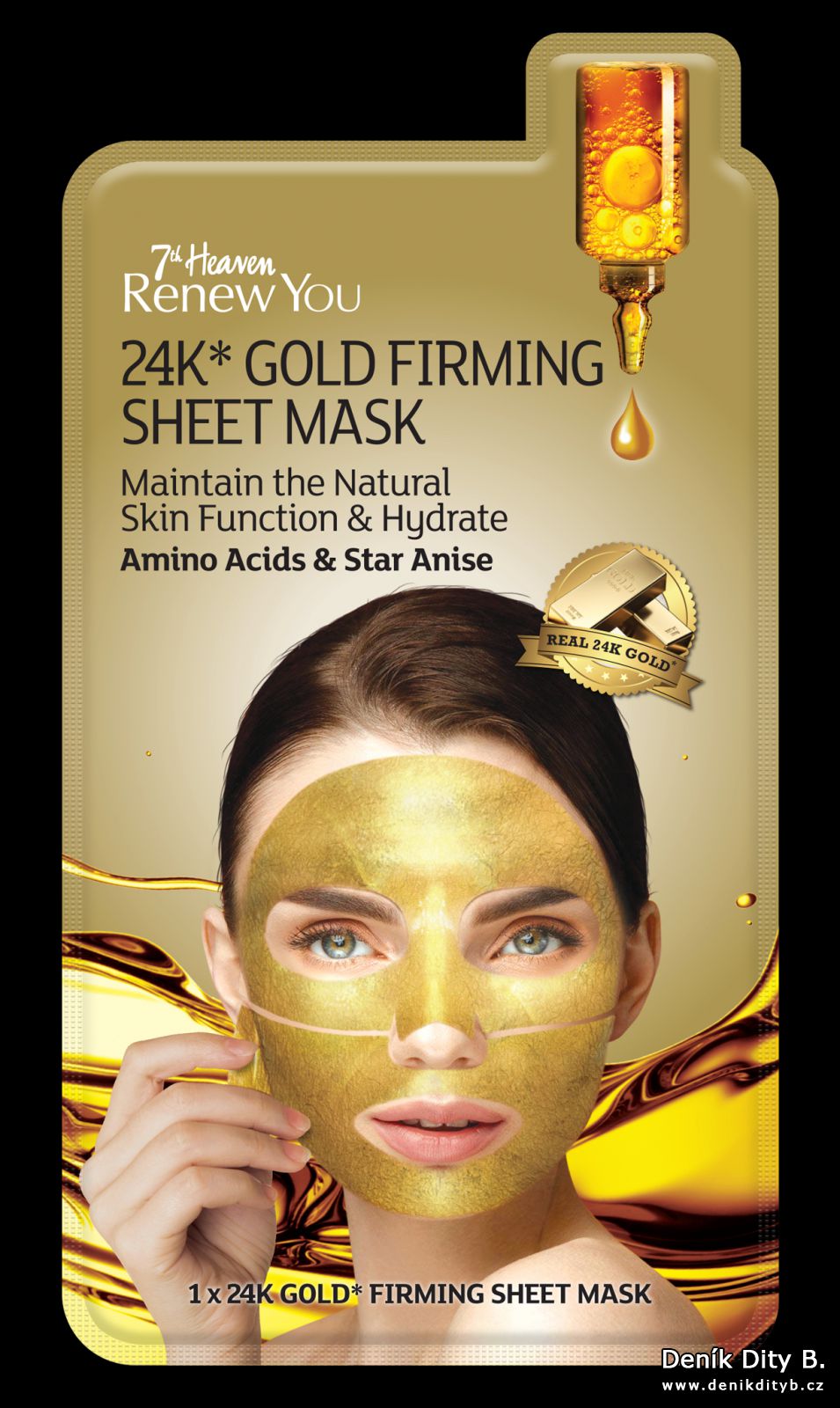 7th Heaven RenewYou 24K zlatá maska je příkladem tzv. sheet masky, která díky svému obohacení o aminokyseliny zajistí okamžitou dokonalou regeneraci létem sužované pleti. Aminokyseliny spolu s dalšími ingrediencemi, jakými jsou pravé 24-karátové zlato a badyán, pleť hydratují i omlazují. Maska obnovuje a udržuje přirozenou funkci pleti, pomáhá předcházet vzniku povislé pokožky. Po jejím použití je pleť napnutější, zářivá a vitální. Doporučuje se týdenní použití, ale lze ji také použít denně jako intenzivní regenerační kúru. Doporučená maloobchodní cena je 99,90 Kč.